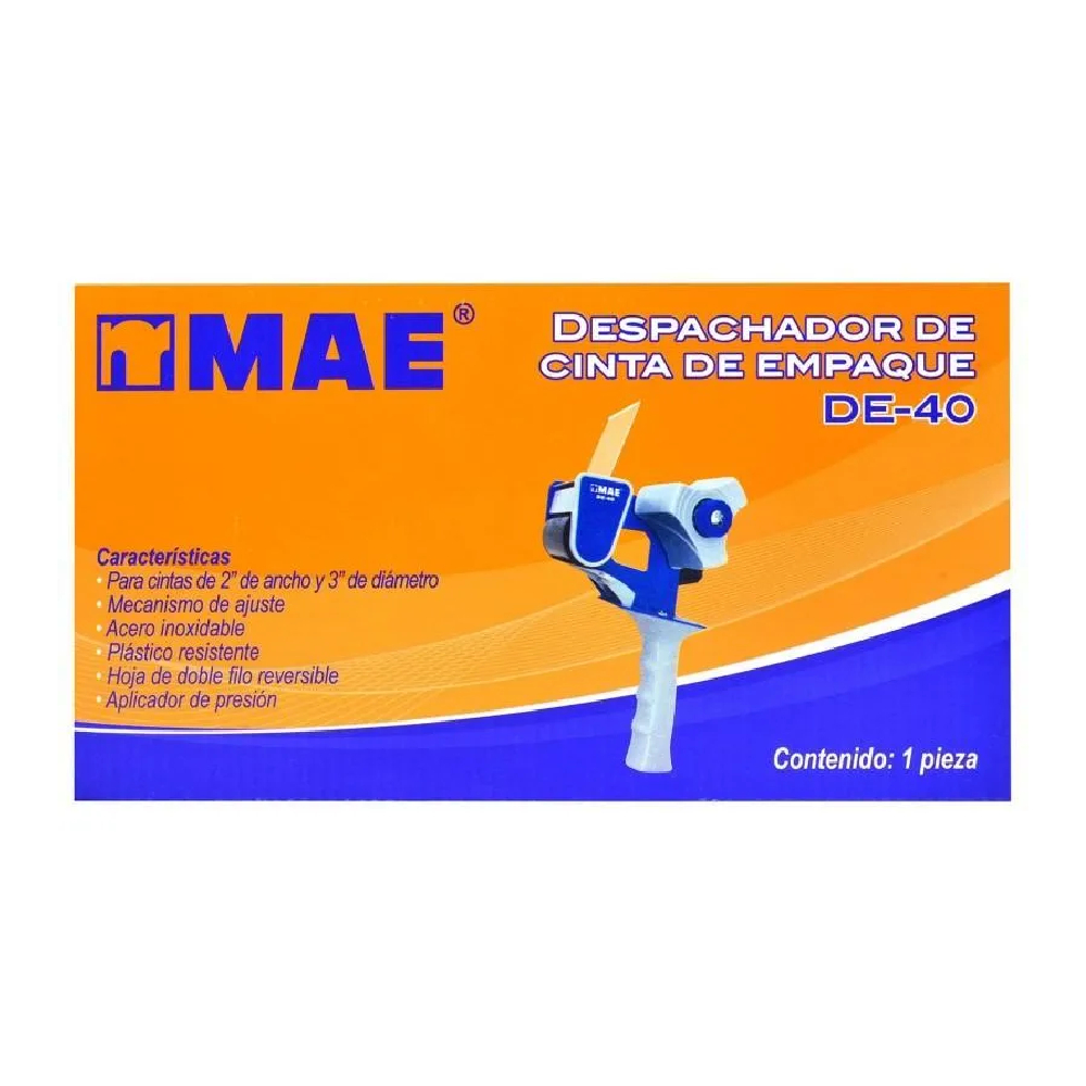 El despachador de cinta para empaque MAE modelo DE-40 (o D-40) es un dispensador manual tipo pistola diseñado para facilitar el sellado de cajas y paquetes. Es compatible con cintas de empaque estándar de 2 pulgadas (48 mm) de ancho.