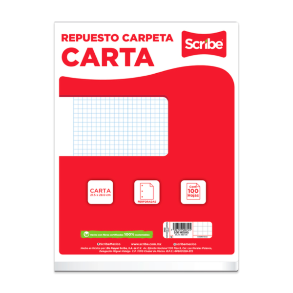El repuesto de carpeta Scribe está compuesto por hojas de cuadro 5mm tamaño carta con perforación universal para su uso en carpetas de anillas. Están diseñadas para mantener los documentos ordenados, evitando el traspaso de tinta gracias a su papel de calidad, lo que las hace adecuadas para uso escolar y profesional.